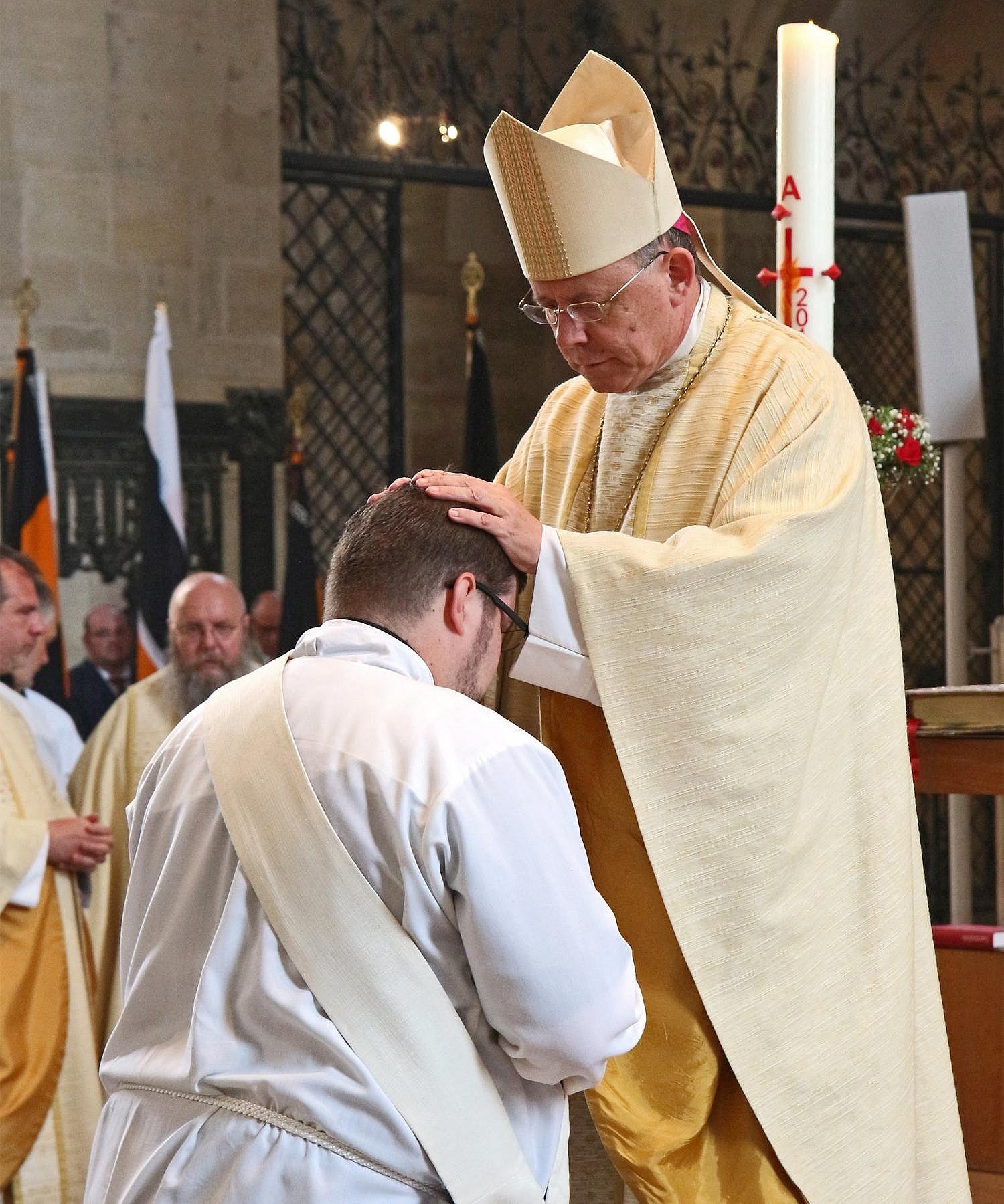 Neben der Salbung mit Chrisam bei der Bischofs- oder Priesterweihe kommen weitere ausdeutende Symbole hinzu: beim Diakon das Überreichen des Evangeliars, beim Priester die Überreichung von Brot und Wein für die Eucharistiefeier und beim Bischof die Überreichung des Evangeliars und der Insignien. Spender des Weihesakramentes ist jeweils der Bischof. Die Bischofsweihe darf nur mit päpstlicher Beauftragung und unter Hinzuziehung zweier mitweihender Bischöfe gespendet werden. (Quelle: Deutsche Bischofskonferenz)