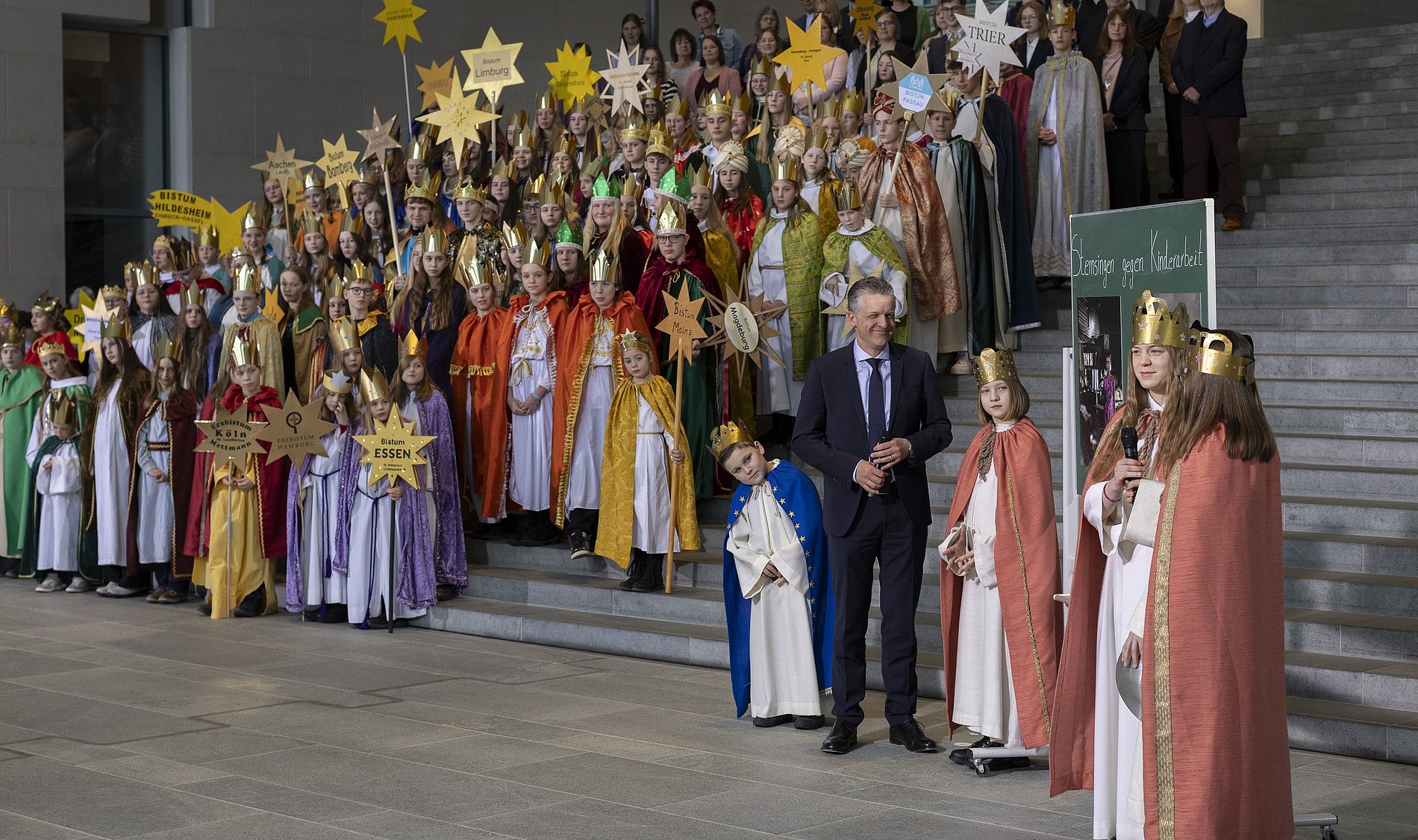 Minister Frei, der „acht oder neun Jahre selber Sternsinger“ in seiner Jugend war, machte gleich mehrfach in seiner Ansprache deutlich, wie sehr er das Engagement der vielen Königinnen und Könige schätzt, die sich an der Aktion Dreikönigssingen beteiligen. 108 von ihnen waren aus allen Himmelsrichtungen nach Berlin gekommen und mit glänzenden Kronen und großen Sternen ins Bundeskanzleramt eingezogen. Mit dabei, eine wichtige Botschaft: „Schule statt Fabrik – Sternsingen gegen Kinderarbeit“ heißt das Motto der aktuellen Aktion Dreikönigssingen. Überall in Deutschland machen die Sternsingerinnen und Sternsinger in diesen Tagen auf ihrem Weg zu den Menschen deutlich, wie wichtig es weltweit für Mädchen und Jungen ist, dass sie zur Schule gehen können statt arbeiten zu müssen.