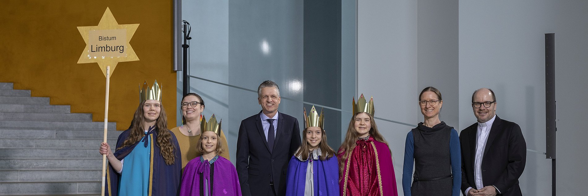 Die Sternsingerinnen Elisa (12), Hannah (15), Nora (12) und Lisa (9) sowie Begleiterin Katharina Weismüller aus der Gemeinde Heilige Dreifaltigkeit in Kelkheim-Fischbach vertraten das Bistum Limburg am Dienstagnachmittag beim Sternsingerempfang zur 68. Aktion Dreikönigssingen im Bundeskanzleramt. Zum Gruppenfoto mit Thorsten Frei, Chef des Bundeskanzleramts, stellten sie sich gemeinsam auf mit Pfarrer Dirk Bingener, Präsident des Kindermissionswerks ‚Die Sternsinger‘, und Daniela Hottenbacher, Bundesvorsitzende des Bundes der Deutschen Katholischen Jugend (BDKJ).