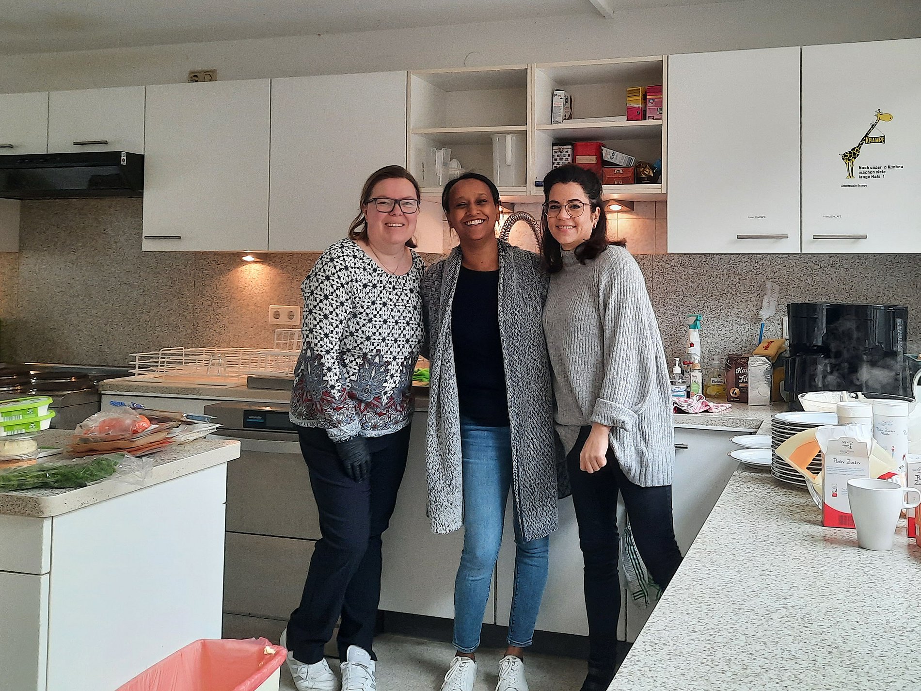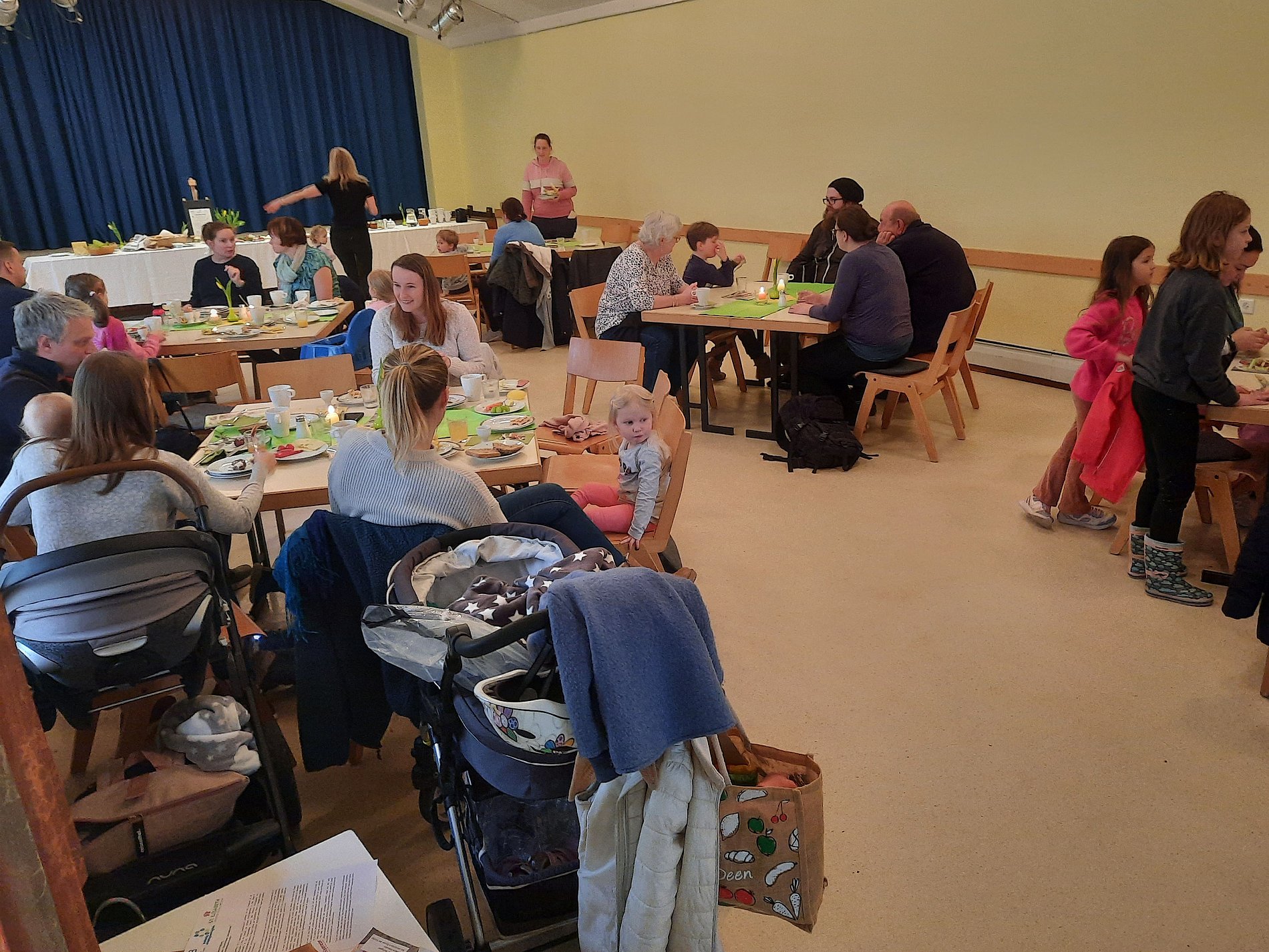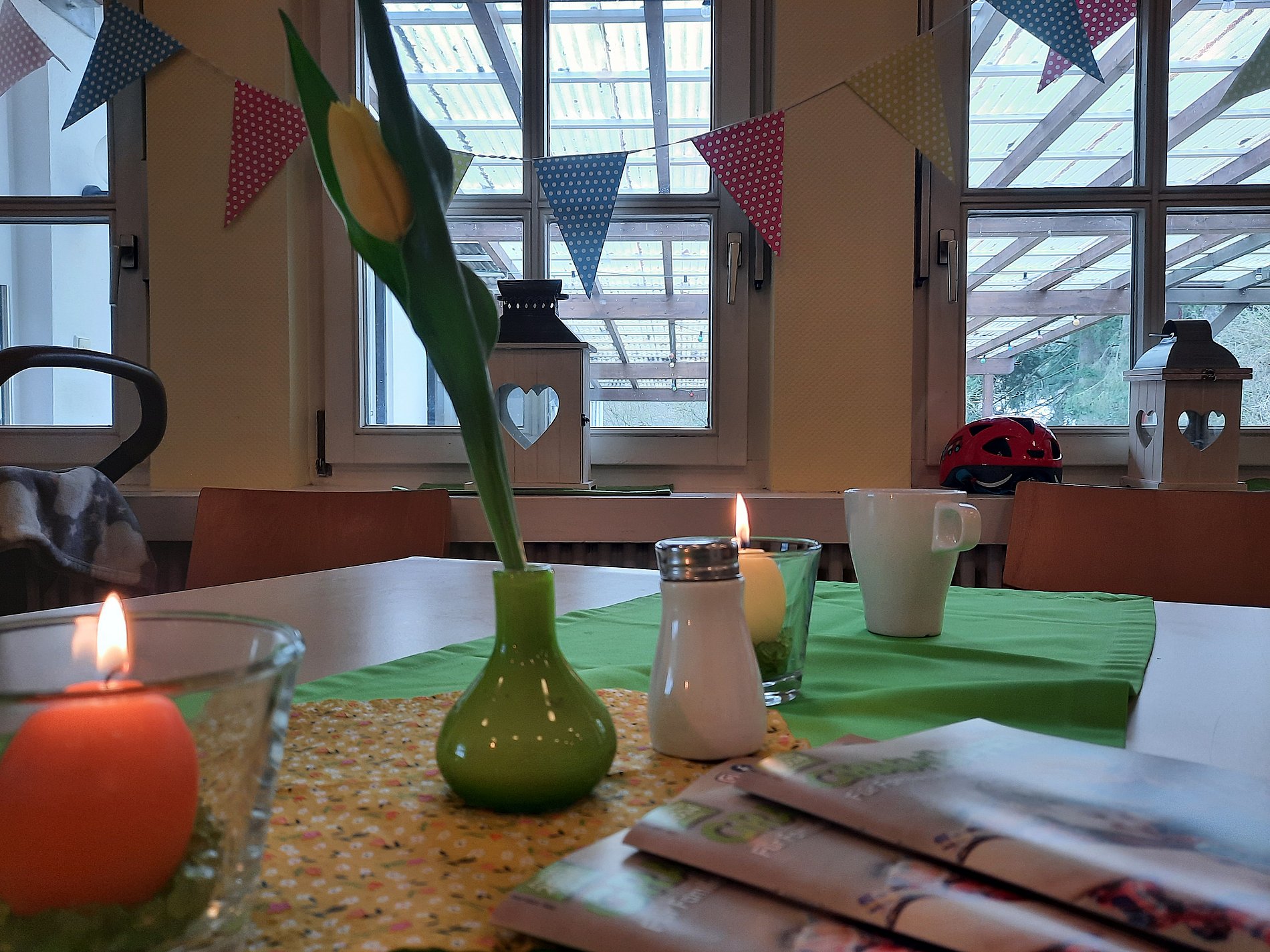Am 16. März 2024 war es endlich soweit - die Türen des Familiencafés FranzisKUSS haben sich wieder geöffnet! Zunächst gab es ein Familienbrunch zum Frühling, bevor ab dem 18. April 2024 das Café wieder regelmäßig geöffnet ist, jeden Donnerstag von 15:00 - 18:00 Uhr. Es kamen viele Menschen groß und klein, alt und jung zusammen, um den Frühling zu begrüßen und zu feiern. Am bunten Buffet konnten vielerlei köstliche Leckereien probiert werden, der Duft aus der Waffelbäckerei zog durch den Raum und zu Kaffee, Tee, Kakao - oder auch zu einem kleinen Prosecco zu späteren Stunde - konnte ausgiebig geplaudert und sich ausgetauscht werden. Heitere Stimmung und frohes Lachen erfüllten das Familiencafé FranzisKUSS nach der Winterpause und wer mochte, hörte sich im Kamishibai Theater die Geschichte vom Frühlingselfen an oder säte eine "Cafépflanze" aus, um den Frühling in den nächsten Wochen zu beobachten.